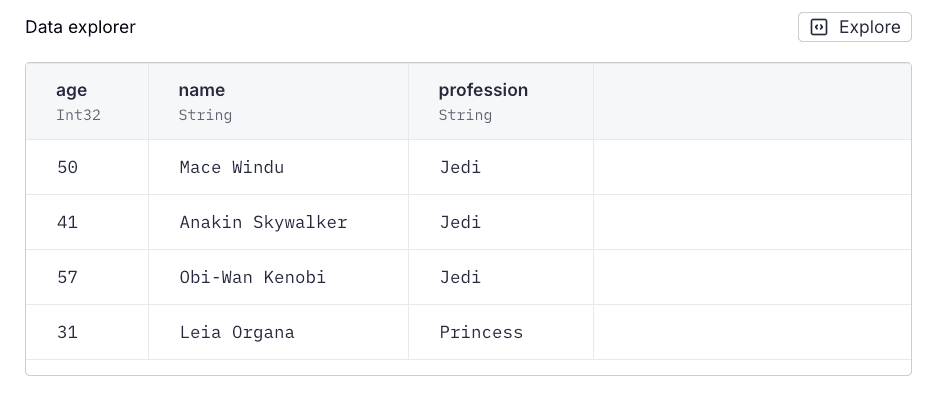 Why were the existed rows not removed? Because the replace process uses the payload rows to identify which partitions to work on. The Data Source is now partitioned by name and not profession, so the process didn't delete the other "Jedi" rows. They're in different partitions because they have different names.